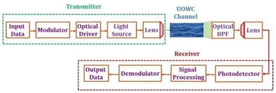 Over the past few decades, the current telecommunication system has gone through incredible growth and expansions in LANs, WANs, MANs, Gbps Ethernet data transmission, optical fiber communications, and UOC [12,19]. T1 links, i.e., local loop line networks, currently have a bandwidth of 1.544 Mbps [13,20]. Today, the fiber to the home service provides the first/last mile connectivity at a data rate of 10Gbps. However, wherever providing fiber cable is difficult, high-data-rate bridging is needed to link the destination points with LANs, WANs, and MANs to resolve data load and first/last mile bottleneck issues to provide end-to-end broadband connectivity for, e.g., a 10 Gbps data link [22]. During the initiation phases, UOC technology was undervalued; some people even said that “the field was not mature, even decades after its birth” [21]. In reflection of the past, UOC was first and foremost used in the 19th century by sending voice signals using optical beams. For example, the A. Graham Bell “photophone”, with a range of 600 feet, was a step forward towards the development of the telephone system [14,16]. The remarkable progress and advances made in devices and systems has made UOC a very attractive alternative option for use in civilian data communications and defense secured communication networks, as well as astrophysics, space engineering, and various underwater imaging applications. Most advancements in the UOC technology were driven by military requirements [17,18].