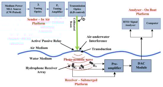 In air-to-water/within-water OWC systems, an optical beam is used as the data carrier, as shown in Figure 3c. UOWC architecture is almost the same as OWC except for the waterproof packaging. The system parameters are decided based on the specific applications, such as underwater sensing, underwater imaging, air-to-water/water-to-air data connectivity, and air-to-water control/guidance. As in Figure 3c, underwater sensors (S1, S2 and S3) are connected using laser beams directly by using data hubs. The data hubs act as coordinating nodes to bridge the data flow control from/to the sensors, ships, and surface buoy. The surface buoy is made up of necessary electrooptic systems to function as an air–water interface to establish data connectivity with the aerial platform (i.e., UAV), which uses FSO links with a low Earth orbit (LEO) satellite, sea shore stations, and neighboring UAVs. A separate laser beam, from the surface buoy, can also be used for the control/guidance of submarine vehicles. Another emerging underwater communication/imaging technology is opto-acoustic communications, where acoustic waves are produced by a high-power laser beam at the air–water interface point (or surface), as shown in Figure 3c. The opto-acoustic-generated sound waves then travel within water, reaching the objects and sensors. The object-scattered acoustic waves travel upwards and are collected by the acoustic sensor located in the UAV. Since the depth of sensor is known, the received echo from the underwater object is processed to extract information. In both OWC techniques, the altitude of the UAV from the water surface must be chosen based on the applications and the parameters of underwater systems (sensor and submarine vehicles).
