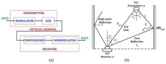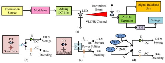 - Sandalidis, H.G.; Vavoulas, A.; Tsiftsis, T.A.; Vaiopoulos, N. Illumination, data transmission, and energy harvesting: The threefold advantage of VLC. Appl. Opt. 2017, 56, 3421–3427. [Google Scholar] [CrossRef]