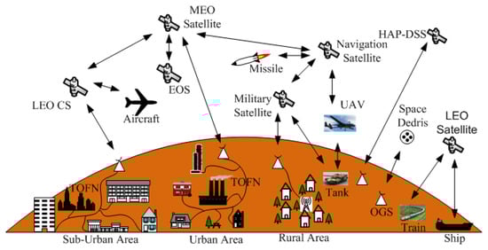 The scintillation index measures random temporal/spatial power variations introduced by light power fluctuations at the detection plan. Even for relatively low scintillation effects, the bit error rate (BER) grows rapidly, particularly in long-range Gbps FSO data links. Thus, to assess the maximum possible link range and data rate, it is essential to calculate the scintillation index fluctuation profile prior to system installation [10]. Overall, the various deleterious atmospheric features lead to severe signal fading and complete optical link disconnection [41]. This must be taken into consideration when measuring the LM in terms of atmospheric condition, since it is crucial for the reliability of the FSO system’s efficiency. We can find various LM models that provide constraints of atmospheric channels as a function of weather parameters in [42,43]. These models support the optimization of the both the transmitter and the receiver base station parameters to install an FSO communication link with the highest possible data rate in a variety of atmospheric turbulence conditions. The optical data link classifications based on the channel (beam path) are (i) terrestrial channel (buildings, towers, and between vehicles); (ii) earth-to-space channel (near-earth spacecraft, drones, UAVs, and space-shuttles); (iii) space channel (between satellites); (iv) enclosed (interior) channel (office electronic appliances); and (v) optic connectivity channel (IC inter connections). The transmitter and receiver installations for these classifications are as follows.