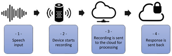 AI speakers have a complex structure, which usually includes at least a smart speaker (e.g., Amazon Echo, Google Home) and a cloud-based voice personal assistant (e.g., Alexa, Google Assistant). A typical request works as shown in Figure 1: In order to start a conversation with the voice assistant, we must first wake the voice assistant up with the words “Ok Google” or “Siri” according to its model. The moment a person utters the words of awakening and begins to communicate with the speaker, voice activation occurs. After displaying a characteristic window or highlighting, we can ask our question. As a result, our request is sent to the server to determine what we said, the data is processed and the response flies back. All this happens in seconds or even fractions of seconds, but with rare exceptions, this is how it works. After the command is processed on the server, the command is either sent back as a return command or a search query is generated, the results of which form a voice response (in the case of a smartphone, also a visual one). In the first case, the light turns on, the door opens, etc., and in the second, the weather is announced or, for example, the latest news. In addition, working through the server allows us to make smart home gadgets more versatile, as we can ensure their work at a distance. For example, turn on the kettle when approaching the house, turn on the lights in the garage in advance, or turn on the robotic vacuum cleaner while working [5,6].