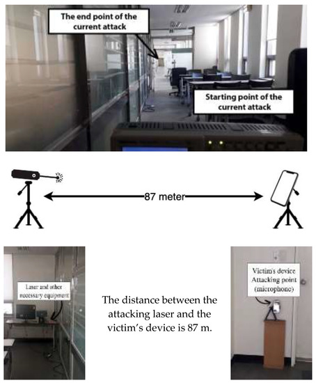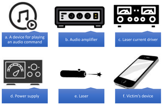 - Seyitmammet, A.; Al-Absi, M.A.; Al-Absi, A.A.; Lee, H.J. Attack on AI Smart Speakers with a Laser Beam. In Proceedings of the 2nd International Conference on Smart Computing and Cyber Security. SMARTCYBER 2021. Lecture Notes in Networks and Systems, Kyungdong University, Global Campus, South Korea 16–17 June 2021; Pattnaik, P.K., Sain, M., Al-Absi, A.A., Eds.; Springer: Singapore, 2021; Volume 395. [Google Scholar]