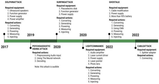 - Nekkalapu, E. The Backend of Inaudible Voice Hacking. Medium. Available online: https://medium.com/@Gentlemen_ESWAR/the-backend-of-inaudible-voice-hacking-60ae7641dec6 (accessed on 10 September 2022).