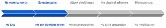 One of the attacker’s goals is to stealthily attack voice assistants. The attacker will send voice commands at ultrasonic frequencies that are inaudible to humans, and at the same time reduce the volume of the device to such an extent that it is difficult for users to notice the voice responses from the assistant [26].