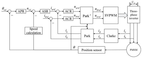 As can be seen from Figure 2, the commonly used position vector control system adopts a three closed-loop control structure, including position loop, speed loop and current loop from outside to inside. APR is the position regulator, ASR is the speed regulator and ACR is the current regulator. The position loop receives the given position command and makes the difference with the feedback value measured by the position sensor, and the obtained result is the given value of the position regulator. The speed command is then calculated by the position regulator. The speed loop receives the speed instruction given by the position loop and makes the difference with the speed signal obtained by differentiating the position signal. The obtained result is the given value of the speed regulator and the axis current instruction is calculated by the speed regulator. In the current loop, the given value of the axis current is always zero. The axis current loop receives the current instruction given by the speed loop and, after making the difference with the current feedback value, the given value of the and axis voltage are calculated by the current regulator, and the and axis voltage are transformed by Park−1 to obtain the voltage value and in a two-phase stationary () coordinate system. The PWM waveform is generated through the space vector pulse width modulation (SVPWM) technology, and the voltage vector of the motor is controlled by the inverter to complete the position vector control of PMSM.