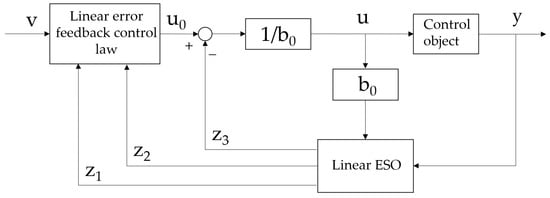 By combining the linear ESO with the linear error feedback control law, a linear ADRC controller has been obtained. For example, taking the second-order system in Equation (23), the structure of the linear ADRC controller is shown in Figure 10.
