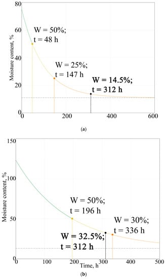 Based on the results of the studies conducted in [32], the following graph of the dependence of moisture content of FCM on time was plotted (see Figure 1):