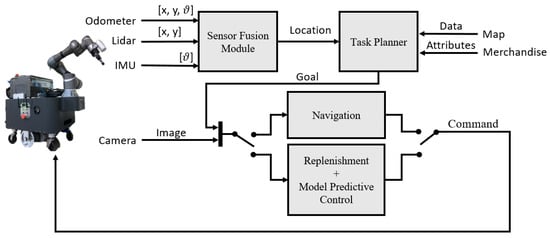 Figure 1 shows a conceptual diagram of the proposed autonomous replenishment system based on the mobile robot manipulator, which includes modules for task plans, navigation and control, and sensor fusion. For its daily operation, the proposed system will routinely send out the mobile robot manipulator to check the shelves for goods that are out of stock and then determine a proper order for replenishment via the task planner, described in Section 2.1. A corresponding path will then be planned, which consists of two parts: one for reaching a given shelf and the other for replenishment. Both of them need to deal with the presence of the customers, but they have their respective constraints during navigation and replenishment, and thus solicit different strategies, as described in Section 2.2. The path for navigation will be converted into motion commands for execution directly, while for replenishment, which involves movements of both the mobile platform and multijoint robot manipulator, it will be further modulated by the model predictive controller, described in Section 2.3. Meanwhile, the module for sensor fusion is utilized to achieve the desired accuracy for execution of the planned path, described in Section 2.4.