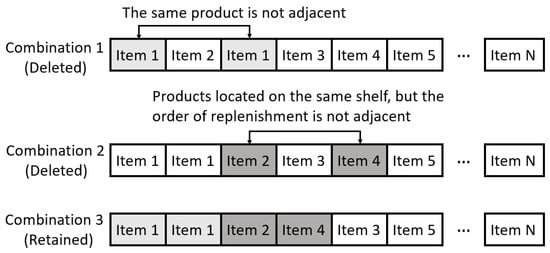 The goal of the task planner is to find a replenishment order that leads to the effective supply of out-of-stock goods. For this purpose, the system adopts the A* algorithm to look for the shortest path among all possible routes. First, the robot conducts a daily patrol of the shelves, and the system records the types and quantities of missing goods, along with their corresponding locations on the shelves, and stores them in a database. Assuming that there are N items out-of-stock goods, and the robot can carry m goods in one run, the A* algorithm will then need to search for the shortest path among N permutations of goods, with m goods for a trip. As the number of searches may be very large, two rules are set up in advance to remove unnecessary searches: (1) goods of the same type and (2) goods on the same shelf must be adjacent, as illustrated in Figure 2. Finally, the combination that corresponds to the shortest path will be used as the goal for path planning by utilizing the strategies described in Section 2.2. Based on the aforementioned plan, the algorithm for effective replenishment is organized as follows: