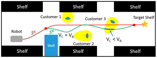 Figure 3 shows how the A* algorithm and DWA-PS are combined together to derive a path with an appropriate execution speed. In Figure 3, the red line indicates the path SA planned by the A* algorithm that serves for the DWA-PS to determine proper linear and angular velocity (, ), which may lead to a new path SB (the green line) that deviates from the original one due to the incoming customer for collision avoidance. With the same SB path to follow, the DWA-PS will further slow down or maintain the speed in response to customer comfort. Details of the A* algorithm for path planning are omitted here because of its popularity, and those of DWA-PS are as follows.