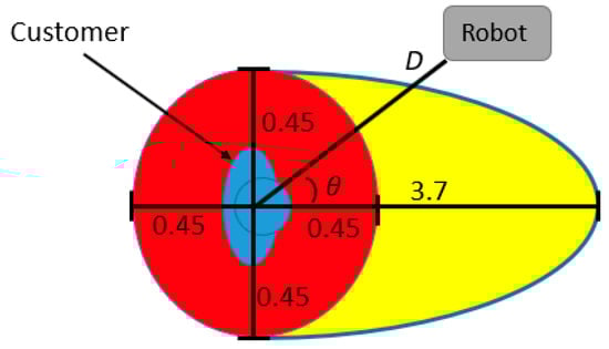 Figure 4 shows an illustration of the personal space, which has a larger front area, formulated as half of an ellipse, as people care more about the incoming object. Its influence on speed adjustment depends on the relative distance D and orientation between the customer and robot. We use a Gaussian distribution function for its formulation, where is the position of the robot, with as the standard deviation along the x and y axis, respectively, selected as 2.8 and 0.24 to match the values of 3.7 and 0.46 for D, and formulate it as