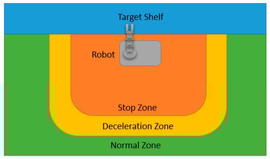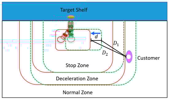 After the robot reaches the target shelf via path SB derived above, the system continues to plan the path for replenishment, which considers both customer’s safety and working efficiency. According to the distance between the robot and customer, we specify several safety zones around the robot [20], as shown in Figure 5. When a customer is present inside the stop zone, the robot needs to be at full stop and decrease its speed within the deceleration zone, while the speed is maintained when staying in the normal zone. The size of the stop zone, subject to variation, is set to be 1.5 m, which is determined based on the speeds of the mobile platform and the customer (set as 1.6 m/s), as well as the working range of the robot arm. By adding another 0.5 m, it forms the deceleration zone, which serves as a buffer between the normal and stop zone. To allow a smoother transition from the initial speed in the normal zone to that in the deceleration zone , it is determined by following a sigmoid function, described in (6) and (7):