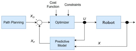 Figure 8 shows the system block diagram for the proposed MPC-based controller, which aims to derive the optimal control input that leads to the goal under system constraints and cost function. In Figure 8, the module of path planning first designs two paths, one for the mobile platform to move distance d intended for raising working efficiency, described in Section 2.2.2 above, and the other for the robot manipulator to conduct replenishment by utilizing cubic polynomial for achieving velocity continuity, denoted as as a whole. The optimizer will then derive the optimal control command U sent to the mobile robot manipulator according to system constraints and cost function. Finally, robot state X, along with U, will be sent to the predictive model to predict a future path . The process will be executed repeatedly until path is finished.