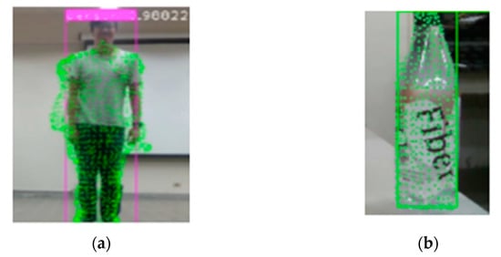 We conducted a series of experiments to evaluate the performance of the proposed system, including a field study in a convenience store. In order to recognize the customers and objects for replenishment during the experiments, the system first analyzed point cloud information collected by the equipped depth camera [27], with examples of customer and bottle images shown in Figure 9, followed by coordinate transformation to obtain their relative position with the robot. In the study, we only dealt with bottle-type objects, which are solid and easy to grab. In our next stage of research, this will be extended to objects of various shapes and stiffnesses. To support real-time execution, the proposed system is equipped with a computer with an Intel Core i5-6500TE CPU, an Nvidia GeForce GTX 1650/4GB, and the Ubuntu 16.04 operating system, along with the ROS Kinetic.