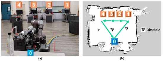 We started with the first set of experiments to check whether the proposed system could guide the robot to reach the target shelves with the desired accuracy. Figure 10a shows a scene in our laboratory that emulates the environment in a convenience store, and Figure 10b the corresponding simulated one. It was arranged to have one warehouse (number 0 in blue) and four shelves (number 1–4 in orange), with one missing item for each shelf. In the path shown in Figure 10b, the robot started from the warehouse, conducted replenishment from shelf 1 to 4 sequentially, and then returned to the warehouse. A total of five laps were executed. Table 1 and Table 2 list the position errors in reaching the shelves in X and Y direction to be less than 4 cm and 1 cm, respectively, where X is the moving direction and Y that for replenishment. As the accuracy achieved satisfied task requirements, the system was ready for the following experiments in the real environment.