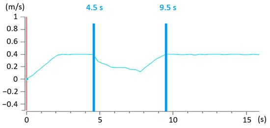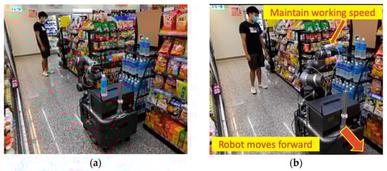 The second set of experiments were conducted in a convenience store near our university to investigate how the proposed system would respond when the staff or customers showed up during replenishment. Figure 11a shows a situation in which the robot needed to pass a customer on the way to the target shelf. To avoid collision with the customer and also consider his personal space, the system activated the DWA-PS algorithm described in Section 2.2.1, which would deviate the robot from the original path and also slow down its speed. Figure 12 shows the corresponding speed adjustment, which occurred between 4.5–9.5 s. After that, the robot returned to its normal speed and continued following the planned path, as shown in Figure 11b. Figure 13a shows another situation in which the robot faced an incoming customer and needed to pass him. Figure 13b shows the resultant paths by applying the DWA and DWA-PS algorithm, respectively. With the person’s space taken into account, the DWS-PS led to a path that kept a larger distance when passing the customer when compared with that of DWS. For the case of a customer coming up from behind, the robot would maintain the original speed when he/she moved slowly and slow down and slightly turn to the side for safety when the customer moved fast to pass by.