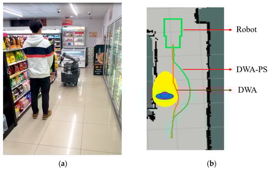 (a) The robot faced an incoming customer and (b) the resultant paths by applying the DWA and DWA-PS.