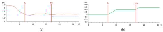 To evaluate the performance of the proposed replenishment and control strategies, Figure 14a shows a situation where a customer approached from the other side of the aisle when the robot was conducting replenishment. As the safety zones were set up around the robot, it needed to slow down and even stop when the customer stepped into the deceleration or stop zone. To raise working efficiency, the system then moved the mobile platform forward to let the customer be located within the normal zone, as shown in Figure 14b, so that the robot manipulator could still maintain the same speed to replenish. Figure 15a shows the relative distance between the customer and the robot during the process, where the blue and red lines indicate it before and after the mobile platform movement, respectively. In Figure 15a, the customer entered the deceleration zone at 7 s, which solicited the mobile platform to move 20 cm forward, as shown in Figure 15b, and later at 17 s, he further stepped in another 10 cm, which again propelled the mobile platform to move forward the same distance, letting the robot still be able to conduct the replenishment task.