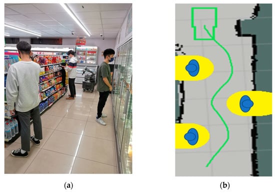 For further investigation, we conducted the third set of experiments for cases involving multiple customers. Figure 16a shows the situation in which the robot needed to pass three customers during navigation. The proposed system successfully found a collision-free path, as shown in Figure 16b. However, when the aisle was too crowded for the DWS-PS to derive a feasible path, it might search for an alternative one first if possible; otherwise, the proposed system would simply command the robot to stop and wait. Figure 17 shows a scene in which the robot managed to conduct replenishment between two customers. Both of them entered the robot’s deceleration zone and stopped at positions approximately 1.6 m and 1.9 m from its front and back side, respectively. Because the target shelf was located close to the customer on the left, the proposed system moved the robot to the right to make room for raising the replenishment speed. Meanwhile, to ensure the safety of the customer on the right, the robot was constrained not to move too close to him. Figure 18 shows the process of distance adjustment for the robot to reach a proper location between the two customers. In sum, successful execution of these three sets of experiments demonstrates that the proposed system was able to execute the replenishment tasks in the presence of customers under the demands of both safety and working efficiency. Please find the connection to the video that shows the experiments conducted in the convenience store at https://youtu.be/xXabdGyErKs in Supplementary Materials.