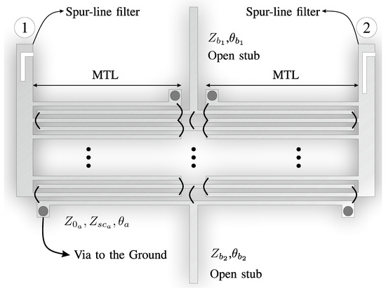 The proposed topology is shown in Figure 1. It is composed of two identical short-circuited MTLs, several shunt open stubs (by simplicity, only two are depicted in Figure 1), and spur-line sections at the input and output of the filter. The analysis is based on the one in [10]. In short, the S-parameters from the transmission line equivalent model are computed and considered to obtain a proper filtering function, and finally, the circuit design parameters. The exact analysis of the short-circuited multiconductor transmission lines was thoroughly carried out in [13].