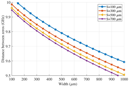 Transmission zeros inherent to the MTL are located at , . However, the exact position of the zeros will vary with the MTL parameters. For instance, bandwidth will be wider and more selective when decreasing both finger width and gap spacing between them, which is equivalent to increasing the coupling factor. The analytical bandwidth of a 6-finger MTL 10 mm long is depicted in Figure 3 for several finger widths and separations. As seen, bandwidth will be wider when decreasing both parameters. Another aspect that must be taken into consideration is MTL finger interconnection. When connecting them, their real length is greater than the one calculated without considering the interconnection. This fact provokes a resonance close to the transmission zero when the length is equal to . Nevertheless, this can be effortlessly corrected by adding wire bondings connecting alternate lines in the middle of the MTLs. Doing it guarantees that the alternate lines maintain the same voltage in the middle of the MTL. Therefore, the propagation of undesired TEM modes is avoided, so resonances are eliminated. Higher-frequency resonances and replicas will be mitigated by the spur-line sections at input and output ports.