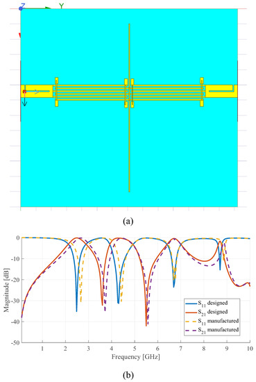 As a design example, a prototype fabricated using Rogers 4350B substrate ( m) has been manufactured. The physical dimensions of the filter are summarized in Table 1. It is noteworthy that a problem in manufacturing tolerances caused a variation in the impedances of the original circuit design. Two identical short-circuited MTLs and two open stubs of different lengths and the same widths are interconnected, as depicted in Figure 4. When considering the dispersion model for microstrip and coupled lines, the values of the characteristic impedances are ( in the manufactured prototype), ( ) and ( ) respectively, using a reference impedance . Figure 5 shows the difference between the simulated S-parameters of the designed and manufactured filters, as well as a photograph of the simulated filter. Simulations have been performed using the full-wave electromagnetic simulator ANSYS HFSS. As seen, the main difference is a small displacement of the bands and mismatch, but despite the huge manufacturing tolerance, this structure is very robust and reliable, and results hardly vary.