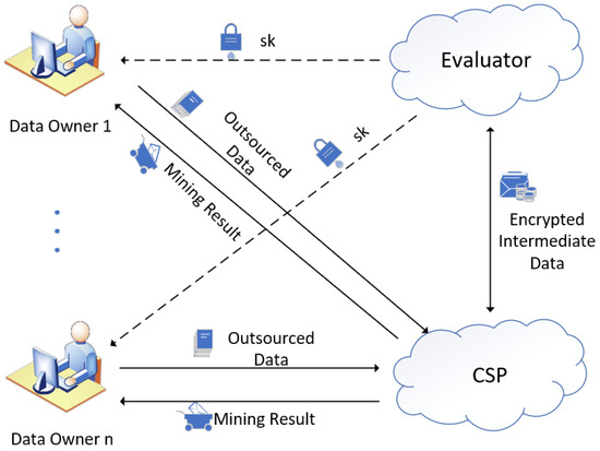 - The CSP is dishonest and curious. Due to saving costs in terms of computation, making illegal profits, or unexpected errors, the CSP may behave dishonestly or erroneously by returning inaccurate mining results to data owners. In addition to that, the CSP is curious about the original transaction information and mining results.
