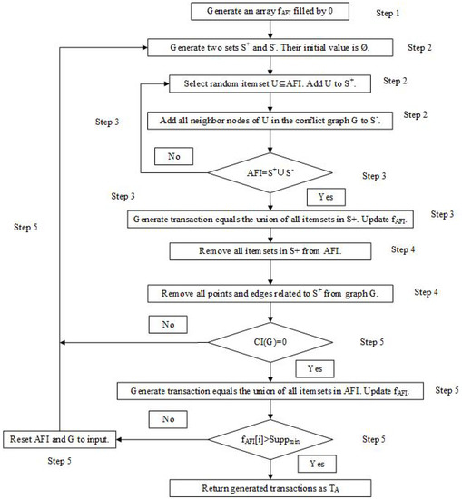 Step 5: Set , repeat steps 2–4 until . Take the itemsets left in as an artificial transaction since they are conflict-free. A maximum of transactions can be generated in this process.