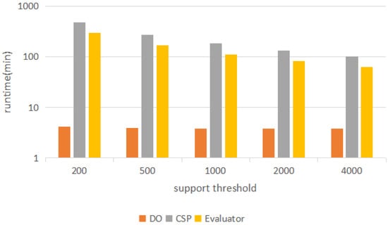 Computational complexity. We evaluate the computational complexity of our protocol by computation costs. To be realistic, we test the performance of our solution using the retail database from [25] for mining. To simulate t data owners, we partition the retail database into t vertically partitioned databases. In this experiment, we fix t to 2 and the proportion of artificial itemsets to the mining results to . In our experiment, we assume that the data owners and the two cloud servers are run with identical hardware conditions. We set different support thresholds for PPFIM with our scheme for the retail database. The running time of the Eclat algorithm and the number of frequent itemsets in mining results are shown in Table 5. We also measure the running time of the data owner, CSP, and Evaluator during the FIM of the retail dataset under different thresholds, as shown in Figure 5.