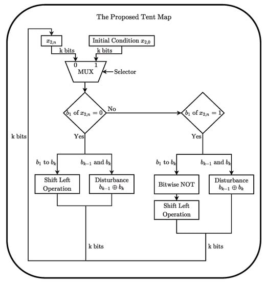 Ultimately, Figure 1 shows the flowchart representation of the digital tent map. Note the small number of blocks and operations that can still generate chaotic orbits. This is due that 1’s complement fixed-point numerical representation allows the replacement of arithmetic operations using a few logic gates.
