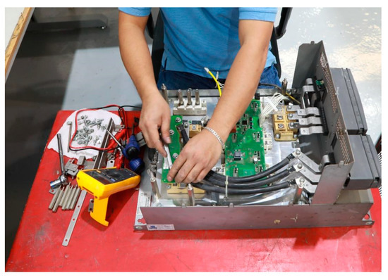 Modern industrial machines are commonly outfitted with embedded electronic motherboards that serve multiple purposes. These motherboards provide power to the machine’s controller, such as through switched mode power supply (SMPS) and inverters, while also managing various industrial processes. For instance, the operations performed by the controller in industrial machines include temperature control, monitoring of digital I/O data flow via programmable logic controllers (PLCs), regulation of the speed of three-phase asynchronous motors through variable frequency drives (VFDs), and display of essential process parameters through human–machine interfaces (HMIs). Examples of industrial EoL products are shown in Figure 3.