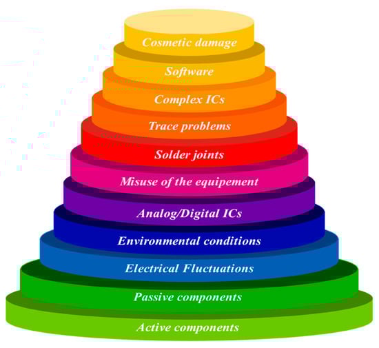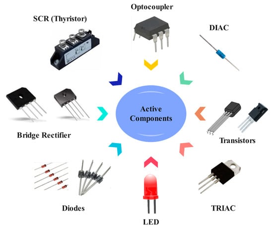 As a result, the survey revealed active components (shown in Figure 6) based on semiconductors, such as various types of diodes (Zener, TVS, Schottckey, Varicap, etc.), transistors (MOSFET, BJT, IGBT), thyristor, and TRIAC, were the most frequently damaged components.