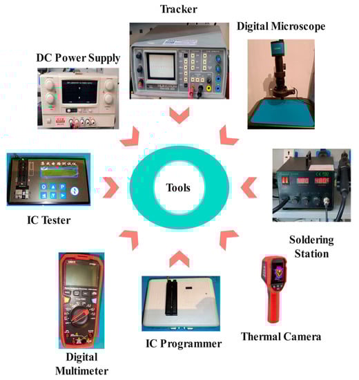 Analyzing and troubleshooting a faulty motherboard requires a strong understanding of theory and analytical thinking as it depends on factors such as symptoms, circuit complexity, and personal experience. In addition to theoretical knowledge, specific and professional tools are necessary for effective PCB troubleshooting, as depicted in Figure 11. For instance, a tracker and high-accuracy multimeter are essential tools for performing various measurements.