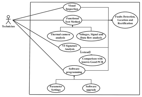 Therefore, engineers and individuals trained in electronics repair typically rely on three primary techniques to troubleshoot faulty PCBs: visual inspection, as shown in Figure 12, voltage-current curve (V/I) analysis, and functional testing. Moreover, these approaches aid in pinpointing the worn-out components and affected areas. The maintenance process is depicted in a unified modelling language (UML) use case diagram, as seen in Figure 13, which outlines various scenarios that technicians can employ to address hardware and software issues.