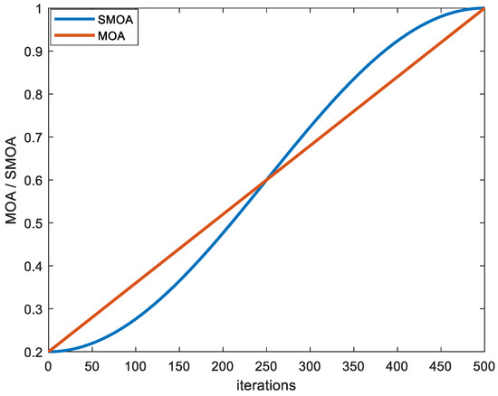 As shown in Figure 3, the MOA in the original algorithm grows linearly and uniformly throughout the search process. However, the intelligent optimization algorithm needs to focus more on the global search in the early iterations, traversing more spaces in a short time so that more feasible solutions can be searched. Later in the iteration, the algorithm needs to focus more on the local search, so that the algorithm can converge better in the field of feasible solutions. The uniformly increasing MOA struggles to match the actual circumstances of algorithm optimization and struggles to strike a good balance between the local and global search. The new SMOA reconstructed in this paper, however, grows slowly in the early iteration and can maintain a lower value, which has a higher probability of being smaller than the random number and conducts a sufficient global search. In the last iteration, it keeps a greater value for a considerable amount of time and is more likely to be higher than the random number , which improves the probability of local search and accelerates the convergence speed.