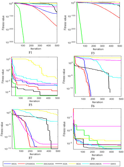 Table 3 shows the test results. Mean is the average, Std is the standard deviation, and bolded data represent this paper’s algorithm findings. In solving the unimodal test functions , The SSCAAOA algorithm manages to reach the theoretically best value in while maintaining the lowest possible standard deviation. Despite the fact that does not converge to the theoretically optimal value, the accuracy and stability of the solution it produces are superior to those produced by other comparable algorithms. The enhanced sine chaos initialization that was provided by the method in this work is able to improve the exploitation capability of the algorithm, as can be observed, and the positive-cosine position update formula also makes the convergence accuracy better. Both of these improvements were made possible by the algorithm in this paper. The algorithm SSCAAOA also has a decent performance in the multimodal test functions , which were previously mentioned, in which both and reach the theoretical optimal value. For , several algorithms did not find the optimal value, but compared with several other compared algorithms, AOA and SSCAAOA have better convergence accuracy and stability, and the accuracy is improved by more than ten orders of magnitude over SMSCABOA and the original SCA. Two fixed low-dimensional test functions. Several algorithms fail to achieve the theoretical optimal value in the test function, but the mean and standard deviation of the algorithm presented in this study are only smaller than those of SMSCABOA, which is not very different from SCA. In , except for AOA and CFAWOA, the mean values of all algorithms are close to the theoretical optimum. However, the SSCAAOA algorithm has the lowest standard deviation, indicating its superior stability. The results of the above investigation demonstrate that SSCAAOA excels at both unimodal and multimodal tasks, boasts superior divergence and stability, and can effectively strike a balance between global and local searches.