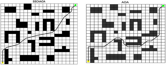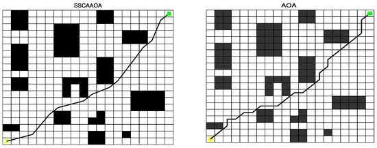 This part runs simulation experiments to compare the original AOA and the enhanced SSCAAOA algorithm in this work in order to confirm the viability of the SSCAAOA method on the path planning problem and the quality of the secondary optimized paths. To ensure the authenticity of the experimental data, 30 independent experiments are conducted for each algorithm, and the experimental data are homogenized. This part creates a 20 × 20 basic obstacle environment and a 20 × 20 difficult obstacle environment, respectively, to demonstrate the algorithms’ flexibility and efficacy. Yellow is the starting point and green is the ending point, and the specific experimental results are as follows: