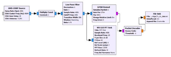 To receive the transmitted symbols on the base station, the flowgraph shown in Figure 19 is designed, and that is certainly the reversed flow of the transmitting uplink flowgraph starting with the block of UHD: USRP Source, which is responsible for combining with the USRP and makes it ready for the reception and passing through a low pass filter, GMSK demodulation, and packet decoding. The block of WX GUI FFT Sink is used to ensure that the USRP does receive the data, as this block generates an FFT plot that gives a peak with the USRP reception. The flow ends with the File Sink block, in which the location of the received data are defined.