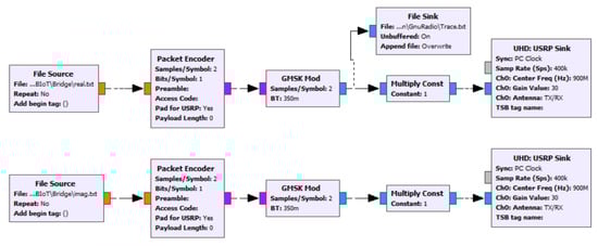 In this section, the implemented GNU radio companion (GRC) flowgraphs are illustrated for the transmitting/receiving uplink, the transmitting/receiving downlink, and the whole system’s hardware set-up.
