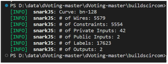 The circom file is created and coded to implement the circuit described in Section 3.2. Different levels are set and the system can be compiled to obtain different amounts of constraints. In this paper, we set the tree to 20 levels and the compilation can generate 5554 constraints, private input 42, common input 2, and output 2, etc., as shown in Figure 7. Four files are also generated at the end, for the generation and verification of the proofs later, as shown in Table 3.