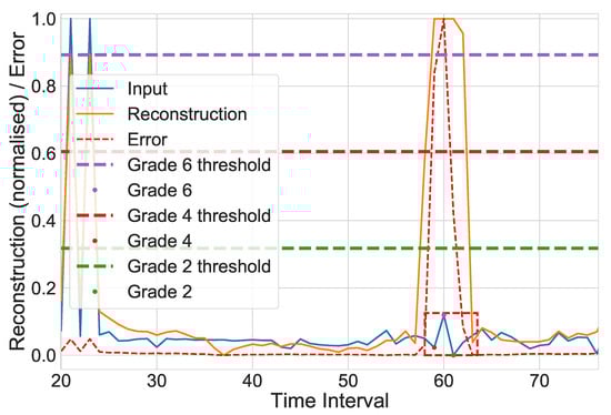 We begin by calculating the absolute error between the input and reconstructed output at each time step into a separate vector, e. Then, iterating, through user-defined severities, a set of severity grades (e.g., ), we calculate a threshold for each grade g, given by . Any absolute error score from e exceeding the threshold appropriate to the current grade is recorded in the form of a dictionary whose keys are the grades, if any, and the values of each set of intervals are considered anomalous. Figure 5 illustrates this process, showing the relative thresholds for each severity grade. It is worth noting here that a cycle with no identified anomalies can be resubmitted for the training of the cluster’s parameter set at the user’s discretion.