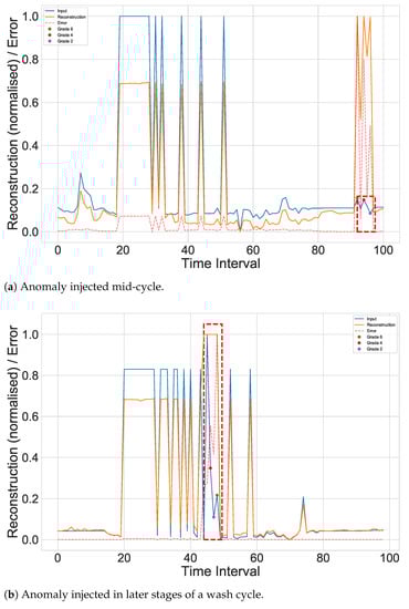 Figure 6 illustrates an excerpt of the post-processed output from distinct cycles from different white goods appliances, each injected with an anomaly at random points of their cycle, marked in red. The system should identify, from the input (Watts, in the case of Figure 6), any or all points within this region as anomalous, depending on the evaluation strategy. The output shows the different lengths of each cycle, demonstrating that the system is not confined to rigid data shaping commonly found in classic machine learning approaches. In both examples, the sharp increase along an expected steadier period in the cycles sufficiently disrupts the autoencoder’s reconstruction, reflected in the running red error line. Table 2 records the performance of the system during the experiment, showing the evaluation metrics used in both point and collective evaluation strategies. The grading mechanism identifies each of these points well. Owing to the bespoke problem we have aimed to solve, it has proven challenging to source or synthesise a comparable public dataset to use in these more complex networks that can still make good use of our incremental clustering stage.