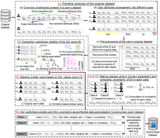 To produce the anonymous version, , of any original user dataset, D, containing N records (i.e., users) with n QIs and a single SA, S, we propose six principal concepts: (i) primitive analysis of the original users’ dataset, D; (ii) computing usefulness weights for the QIs using an ML approach (random forest); (iii) ranking similar records via their QI values by employing cosine similarity; (iv) making equivalence classes from a similarly ranked users matrix based on the parameter of privacy (e.g., k), (v) computing the uncertainty of each EC w.r.t. SA values; and (vi) attain flexible data generalization by simultaneously considering both the usefulness weights and the uncertainty. All concepts are interlinked and help in transforming D into . Concise details of each concept are presented below.