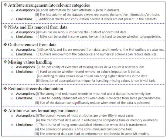 Later, we find and remove outliers, such as unrealistic values for certain attributes (e.g., an age value of 500 years instead of 50), by visually inspecting the logical range of each attribute and performing min–max analysis. Outlier detection and removal significantly contribute to accurate data analytics. In some cases, we perform format conversion and enrichment to obtain desired statistics before actual data anonymization. For instance, we represent categorical values of the quasi-identifiers (QIs) with numbers to compute similarity/distance between users. Additionally, missing values are effectively handled by considering the nature of the attributes. For example, we impute missing values in numerical attributes with the mean of the particular column, while we substitute missing values in categorical columns with less representative values to increase diversity in data. We also remove redundant records that are located next to each other and have identical values in a row. A comprehensive overview of the assumptions and limitations of the pre-processing process is demonstrated in Figure 3. Overall, pre-processing allows us to achieve a truthful and error-free D for further operations.