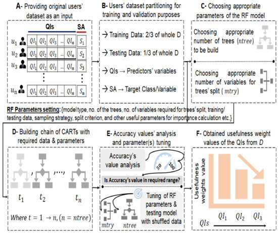 In addition, the unique features of RF, such as the ability to handle outliers, missing values, and large records, have made it a very popular ML method. It gives accuracy/error-rate results by accumulating each tree’s result via majority voting or summing of errors. Hence, results are more reliable and accurate. It is worth noting that a gradient-boosting algorithm can also be used for a similar task (e.g., identifying useful QIs from data). However, the selection of optimal hyperparameters is very challenging and computationally expensive. Furthermore, gradient boosting often experiences the problem of overfitting when unoptimized hyperparameters are used. Rigorous parameter tuning and extensive cross-validation increases are needed while experimenting with gradient boosting, leading to higher computing costs [64]. In contrast, it has fewer parameters, which can be tuned flexibly in considering the problem size. In addition, the utilization of information–theocratic concepts such as the Gini index/Gini impurity in the tree construction process makes it more suitable for data-driven applications. In this paper, we employ RF to identify and rank the most useful QIs from D to effectively enhance the utility of . A descriptive block diagram of the procedures employed to compute usefulness weights is given in Figure 4.