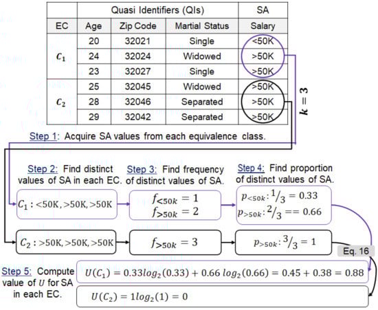 In Algorithm 1, user matrix X and k are supplied as input, and the set R of the ECs is returned as output. At the start, the number of records is compared with k, and if X contains fewer records than k, the processing stops (line 2). If the number of records is more than k, the processing continues to divide users into classes. Initially, the set R is an empty set. Later, we find the number of ECs using the records in X and the value of k, and the two cases are separated from each other (line 6). Case I is relatively easy because the number of classes is a whole number, and X’s partition is made with n ECs, where each EC contains at least k users (lines 7–10). Case II is relatively complex because some records are left over from the assignment process. In this case, we partition X into n ECs, where each EC contains at least k users similar to Case I (lines 12–14). Later, we find the remaining records and assign them to classes by performing a similarity-based proximity analysis (lines 15–16). Afterward, we upgrade the ECs with the new records and add them to set R (lines 17–18). Finally, set R with multiple ECs is returned as the output from Algorithm 1. Each EC can contain at least k users, or users, where . These classes contain highly similar users with distinct (or the same) values for the SA in each EC. From a privacy point of view, SA values should be fairly distributed in each EC. Moreover, we compute the SA value uncertainty in each EC to find a suitable level for data generalization.