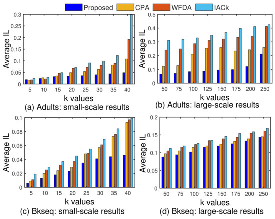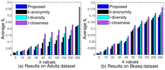 From the results, it can be seen that the number of classes with identical SAs decreases when k increases. The Adult dataset has a higher imbalance compared to Bkseq and, therefore, the number of classes with identical SAs is relatively higher than in the Bkseq dataset. Due to the higher imbalance in the Adult dataset, the average value is also higher. In contrast, the Bkseq dataset is balanced and contains many diverse values for SA; therefore, the average values are small. From the models, k-anonymity has a lower performance than other models. In the algorithms, IACk exhibits a deficient performance by not considering diversity in the SA column. The proposed approach demonstrates lower re-identification risk in homogeneous attacks compared to existing solutions. The main reason for this is the consideration of U in each EC, whereas most existing solutions often ignore uncertainty in the SA column, leading to higher re-identification risk. These results reinforce the significance of our approach in terms of better safeguarding against re-identification risk.