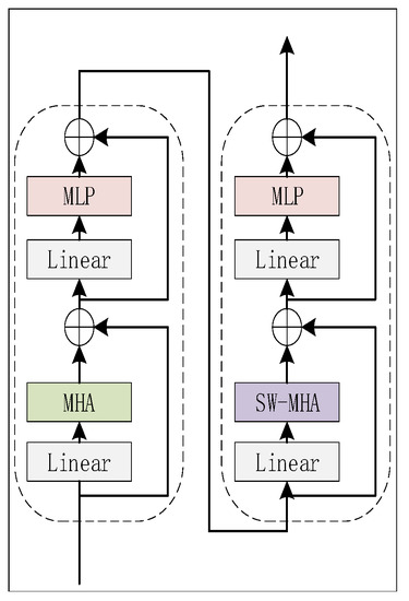 Figure 8 shows the architecture of the network. This network takes as input. Since the token size of this network is 324, is divided into 30 × 324 by Patch Partition layer. The window size is of 10 tokens and the relative position encoding (RPE) B is a learnable variable of size . B is calculated by substituting its index into an RPE matrix of size . The size of the RPE matrix is determined by the number of tokens in the window, and the relationship between tokens and windows is shown in Figure 9. The Swin Transformer Block contains two layers: one for MHA calculation, and another for shifted window MHA(SW-MHA) calculation. Figure 10 shows the detail of the Swin Transformer block. The window calculates MHA firstly, which is introduced in Section 2.3. In order to calculate SW-MHA, the feature map must shift circularly as shown in Figure 9. Then, the SW-MHA can be calculated the same way as the MHA.