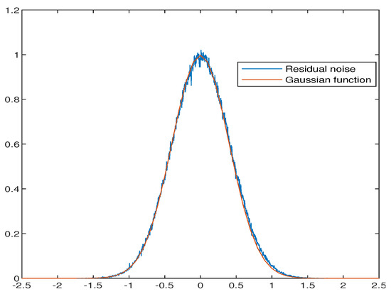 Moreover, the residual noise is exported and fitted to the Gaussian function in Figure 12. The blue line indicates the distribution of the residual noise from dB to 5 dB, while the red one is the Gaussian fitting of these data. Both the Jarque-Bera test (JB-test) and Figure 12 indicate that the residual noise preserves the Gaussian distribution.
