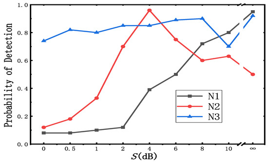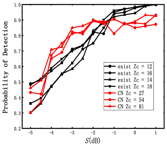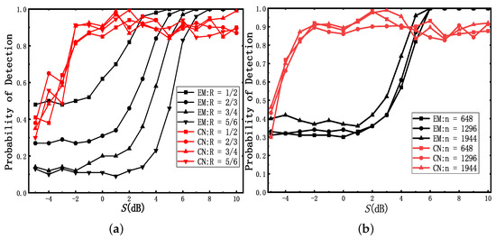 The for different code-rates is shown in Figure 15a, when the code word length is fixed at 648. Statistical methods are used in [7] for coding blind recognition. EM (expectation-maximization) represents the method in [7]. CN (cascade-network) represents the method we proposed. According to Figure 15a, the probability of detection increases as the code-rate becomes lower [7], while the of these four code words is mainly consistent using our method. In addition, it is easy to find that the method we proposed performs better when the S is between 0 dB and 5 dB. Although the accuracy of our method is not good enough when S is larger than 5 dB, it can also precisely recognize H in most cases.